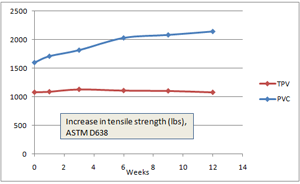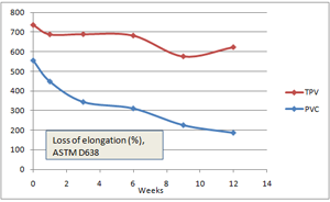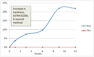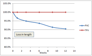 PVC là một lựa chọn phổ biến cho con dấu, và đã có từ rất lâu. Tuy nhiên, theo kinh nghiệm của chúng tôi, PVC dẻo không giữ được tốt trong những năm qua, đặc biệt là nếu chịu không khí ấm. Trong một thử nghiệm lão hóa nhiệt được thực hiện bởi một phòng thí nghiệm độc lập, Reed đã giữ hàng chục mẫu TPV và PVC trong một buồng lão hóa nhiệt trong 12 tuần ở 100 ° C. Kết quả thật đáng kinh ngạc: các mẫu TPV thay đổi rất ít, nhưng các mẫu PVC co lại gần 10%, và trở nên cứng hơn và kém đàn hồi hơn nhiều. Tất nhiên, con dấu của bạn có thể không bao giờ nhìn thấy những nhiệt độ này, nhưng kết quả cho thấy hai vật liệu này sẽ hoạt động như thế nào ở nhiệt độ thấp hơn trong một khoảng thời gian dài. Ngoài ra, các loại TPV và PVC khác nhau có thể mang lại kết quả hơi khác nhau, nhưng những phát hiện này phù hợp với hầu hết các tài liệu hiện có. Kết quả của chúng tôi được lập bảng dưới đây.
