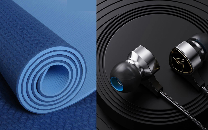 Đồ dùng thể thao: Bàn chân lặn, kính bơi, đệm yoga, bàn đạp xe đạp, bóng tập, dây kéo tập gym,...