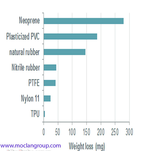 Nhựa Nhiệt Dẻo TPU ít bị ảnh hưởng bởi các lực tác động bên ngoài. Nên sản phẩm làm từ loại nhựa này có tính thẩm mỹ cao, bề mặt trơn láng, không bị trầy xước và tuổi thọ lâu dài. Khả năng chống mài mòn của một loại vật liệu được xác định bởi khối lượng hao hụt tiếp xúc trong thí nghiệm tiêu chuẩn. Lượng vật liệu bị bào mòn càng thấp thì vật liệu ấy càng chống chịu tốt với môi trường. Bạn có thể tham khảo qua biểu đồ dưới đây: